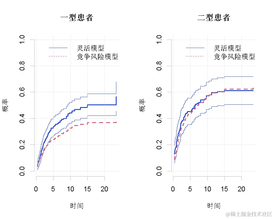图1(a)显示了估计的两种原因的累积发生率曲线。在图1(b)中,我们构建95%的置信区间(虚线)和95%的置信带。