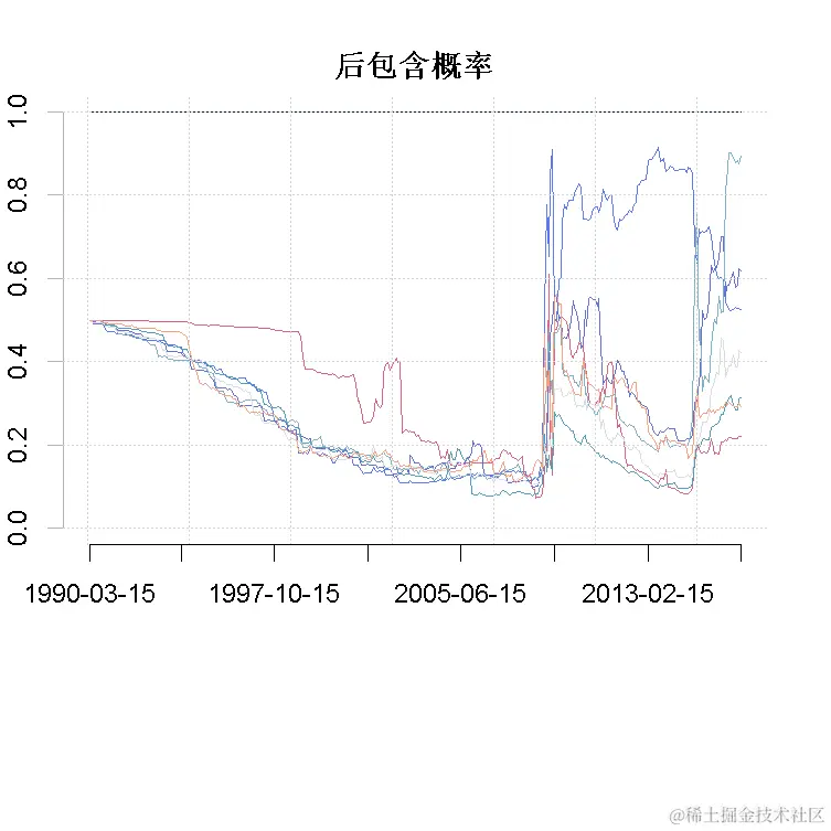 plot( post.incl[,i+1], type="l", col=col[i+1], ylim=c(0,1), xlab="", ylab="", main="后包含概率", axes = F)