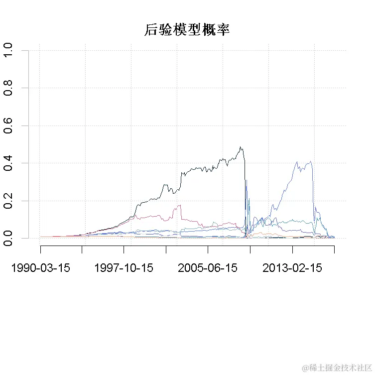 plot(x$post.mod[,i+1], type="l" ylab="", main="后验模型概率", axes = F)