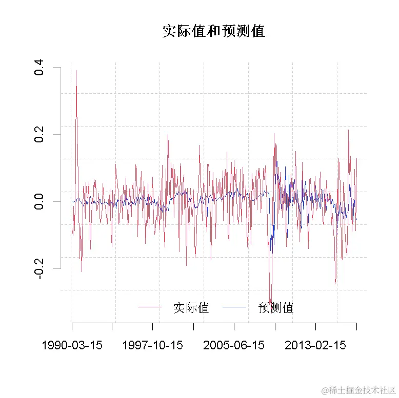 plot(x$y, type="l", ylim=c(min(x$y,x$y.hat),max(x$y,x$y.hat)), xlab="", ylab="", main="实际值和预测值", axes = F)