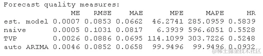所选的DMA模型的RMSE比两个基准预测要小,但与Auto ARIMA相当。MAE的情况也类似。然而,Auto ARIMA的MAE比选定的DMA模型小。另一方面,选定的DMA模型在所有竞争性预测中具有最高的命中率。更精确的比较可以通过Diebold-Mariano检验来进行。