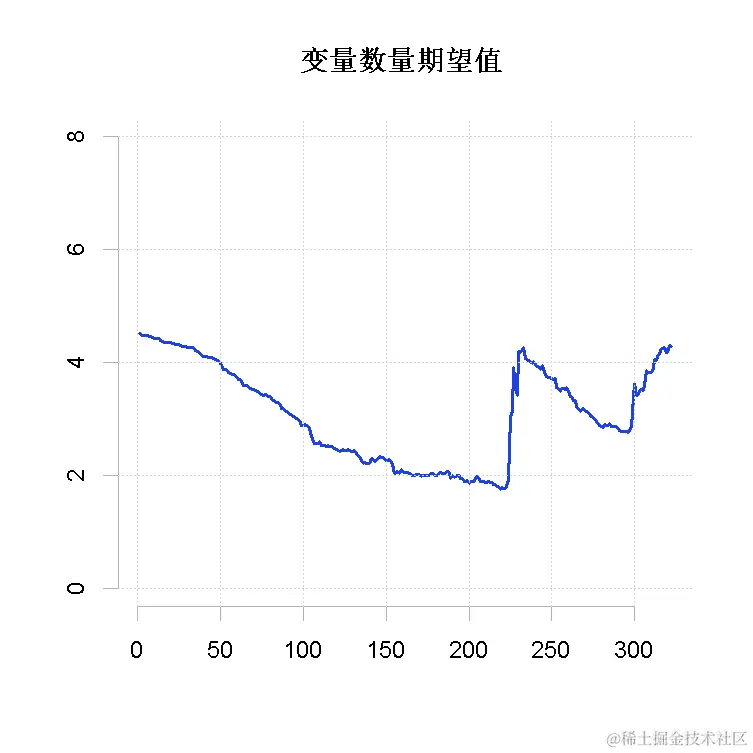 plot( exp.var, type="l" ylim=c(0,ncol(x$models)) main="变量数量期望值 ", axes = F)