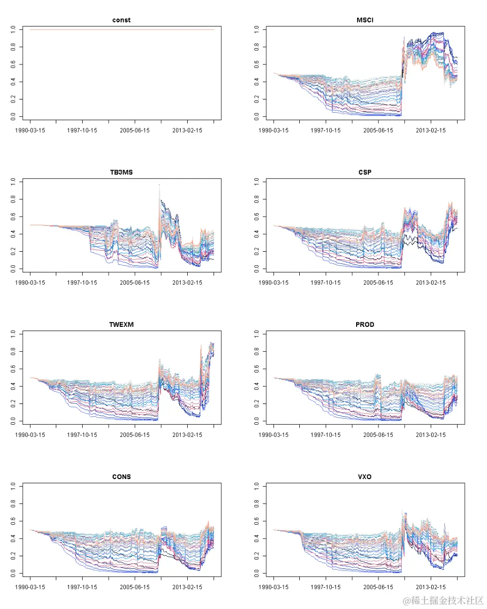图3应与图4可以看出。虽然,相对变量的重要性可能很高,但这个变量的回归系数的预期值可能在0左右。事实上,高的相对变量重要性同时观察到MSCI、CSP和TWEXM的预期回归系数不为零。所以,这个分析现在证实了这三个因素在2007年和2013年之间对原油价格起到了重要的预测作用。自2013年以来,股票市场的作用减少了,被汇率所取代。在2013年前后,最重要的作用是由发达股票市场发挥的。