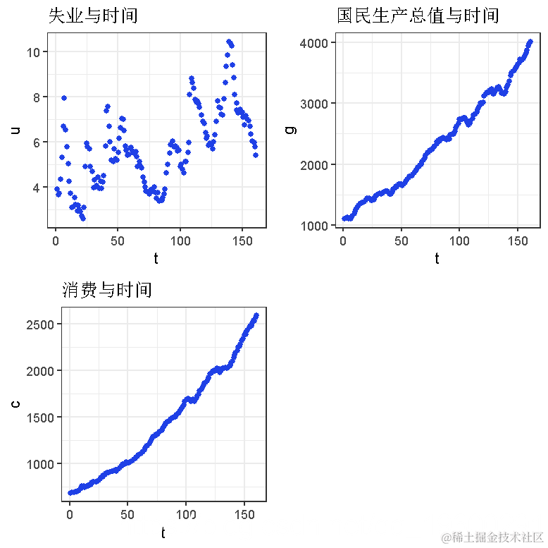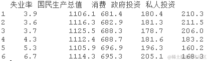 我们将使用经济序列数据。数据是一个五个季度的经济序列,包含以下数字变量:季度失业率、国民生产总值、消费、政府投资和私人投资。有161个观测点。