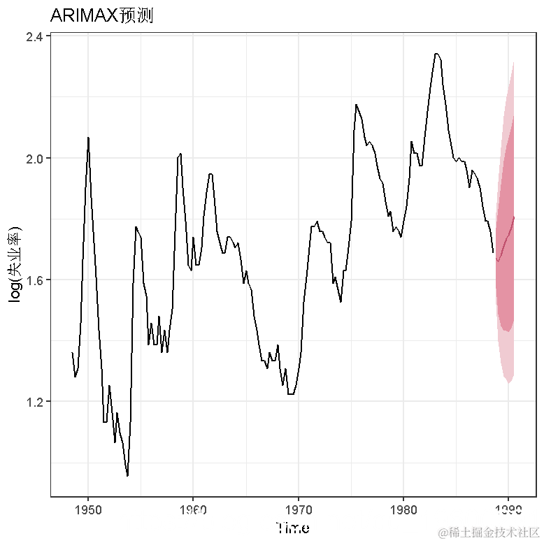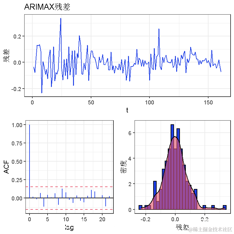 其中εt是一个白噪声序列。ARIMAX模型有两个误差项,一个是回归模型的误差,我们用jt表示,另一个是ARIMA模型的误差,我们用εt表示。只有ARIMA模型的误差被认为是白噪声。