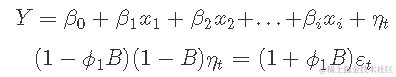 其中Y是xi预测变量的因变量,ε通常被认为是一个不相关的误差项(即是白噪声)。我们考虑了诸如Durbin-Watson检验等检验方法来评估ε是否有显著的相关性。我们将在方程中用nt代替ε。误差序列被假定为遵循ARIMA模型。例如,如果 nt 遵循一个 ARIMA(1,1,1)模型,我们可以写成