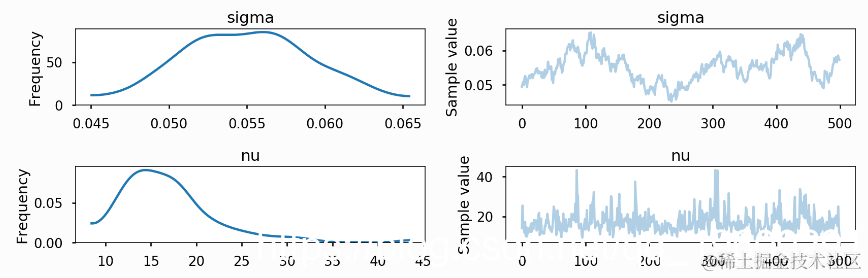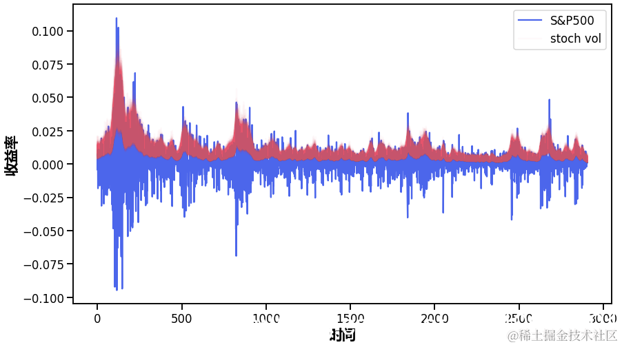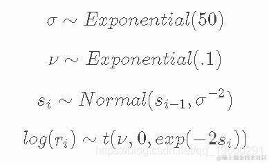 资产价格具有随时间变化的波动性(逐日收益率的方差)。在某些时期,收益率是高度变化的,而在其他时期则非常平稳。随机波动率模型用一个潜在的波动率变量来模拟这种情况,该变量被建模为随机过程。下面的模型与 No-U-Turn Sampler 论文中描述的模型相似,Hoffman (2011) p21。