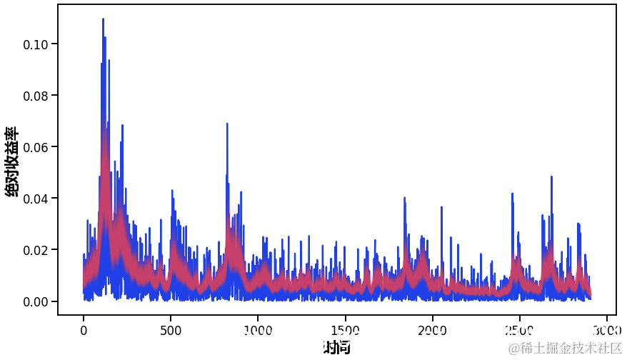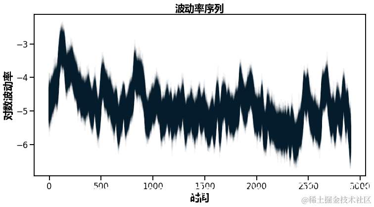 正如你所看到的,波动性似乎随着时间的推移有很大的变化,但集中在某些时间段。在2500-3000个时间点附近,你可以看到2009年的金融风暴。