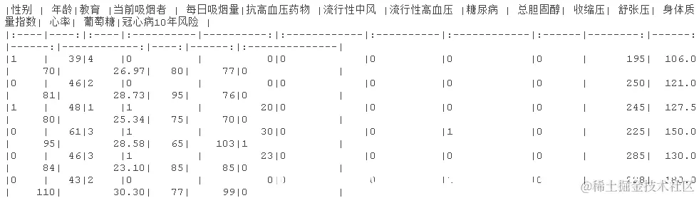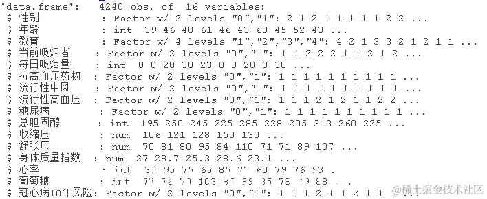 该数据集是FHS数据集的一个相当小的子集,有4240个观测值和16个变量。这些变量如下: