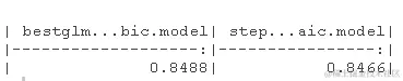 AIC方法和BIC方法都能产生相同的准确性。该选择哪种方法呢?我宁愿选择AIC,因为该模型实例有更多的预测因素,因此更有洞察力。然而,选择BIC模型实例也是合理的,因为它更简明。与model1的准确度相比,我们通过变量选择在准确度上有0.8475-0.842=0.00550.8475-0.842=0.0055的提高。然而,我们失去了关于其他预测因子和因变量关系的信息。