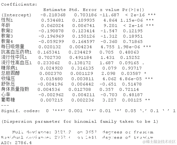 基于AIC的step()函数将模型变量减少到8个:男性、年龄、cigsPerDay,prevalentStroke、prevalentHyp、totChol、sysBP和glucose。值得注意的是,通过step()找到的最佳模型实例具有不显著的变量。