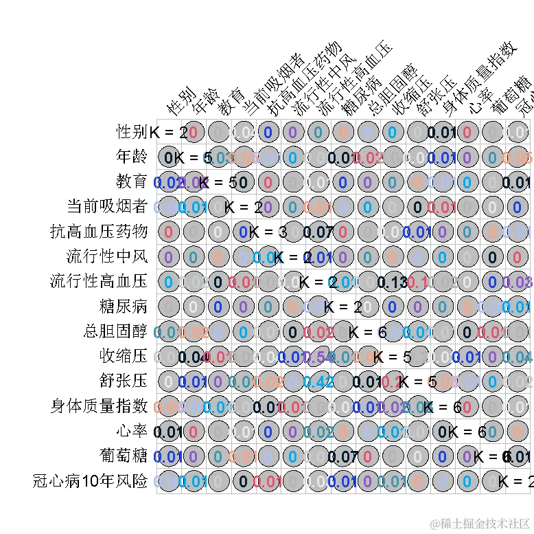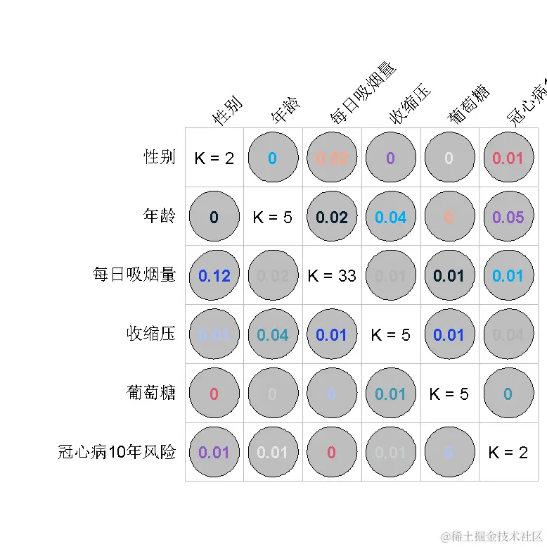 从矩阵图上的tau值及其背景形状,我们可以看到cigsPerDay可以完全解释currentSmoker的变异性。这并不奇怪,因为如果我们知道一个人每天抽多少支烟就可以断言我们知道一个人是否是吸烟者!