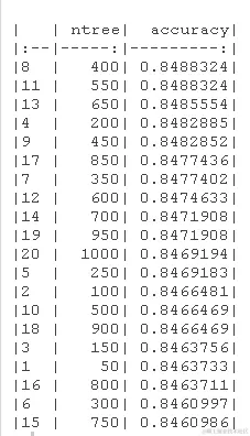 我们可以看到,在50到1000棵树的范围内,RandomForest模型的最高精度可以通过设置CV方法的树数等于400来获得。图中的红线显示了我们从逻辑回归模型实例中得到的最佳CV精度。由于OOB的最高准确率高于CV的最高准确率,所以我选择了CV的准确率,使其更加谨慎。ntree=400的CVaccuracy=0.8486CVaccuracy=0.8486,比最好的逻辑回归模型差0.00020.0002! 然而,如果我们考虑OOB的准确性,那么RandomForest模型比最佳逻辑回归模型好0.00120.0012。