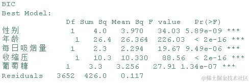 基于BIC的bestglm::bestglm()将模型变量减少到5个:男性、年龄、cigsPerDay、sysBP和葡萄糖。所有的变量都是非常显著的,正如预期的那样。