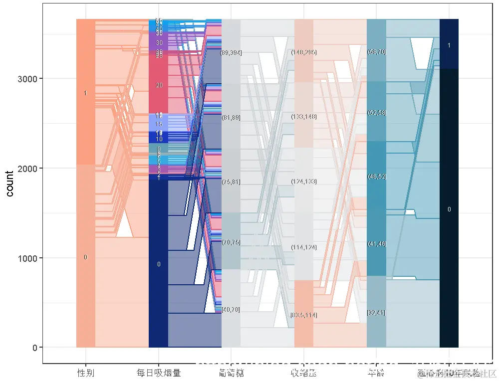 然而,平行坐标仍然显示了一些有趣的点。例如,年龄组与 "十年健康发展 "结果之间的关联很有意思。较低的年龄组在TenYearCHD==TRUE中的参与度很低,这意味着年龄与该疾病有正相关。另一方面,与男性相比,女性(男性==FALSE)在0支烟和[1,20]支烟组的贡献更大。换句话说,男性倾向于抽更多的烟,而且是重度吸烟者。