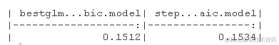 例如,后向选择法是基于不显著变量的P值。淘汰继续进行,直到AIC显示没有进一步改善。还有stats::step()和bestglm::bestglm()函数来自动进行变量选择过程。后者的软件包及其主要函数有许多选择信息标准的选项,如AIC、BIC、LOOCV和CV,而前者的逐步算法是基于AIC的。