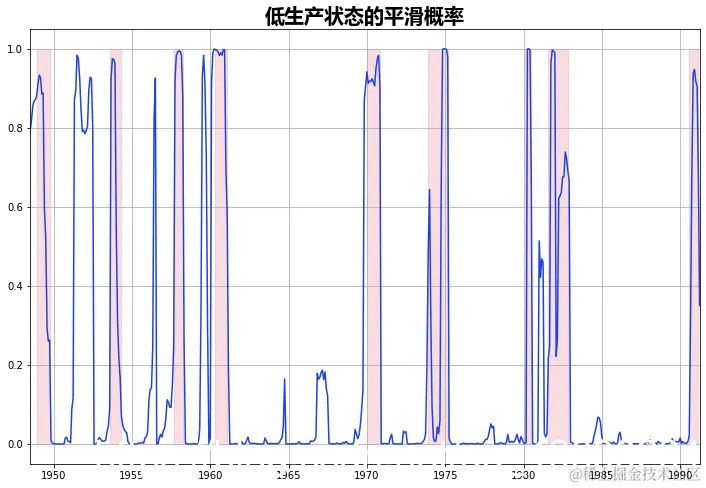 下面我们绘制了经济运行在低生产状态下的平滑概率,并再次将NBER的衰退情况纳入其中进行比较。
