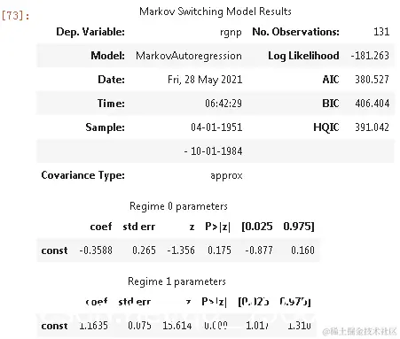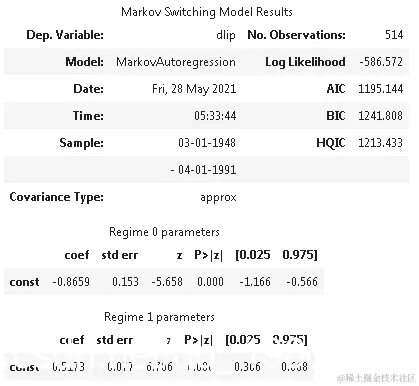 该模型类别是时间序列部分中的MarkovAutoregression。为了创建这个模型,我们必须指定k_regimes=2的区制数量,以及order=4的自回归阶数。默认模型还包括转换自回归系数,所以在这里我们还需要指定switch_ar=False。