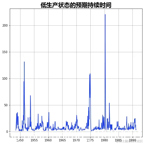 利用时间变化的转移概率,我们可以看到低生产状态的预期持续时间如何随时间变化。