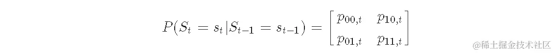 其中 pij,tipij,t 是在 t 期间从区制 i 转移到区制 j 的概率,并定义为。