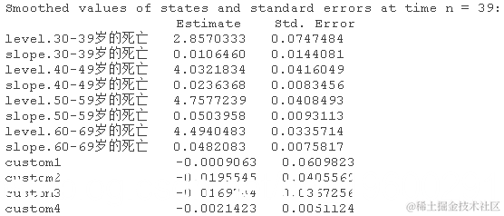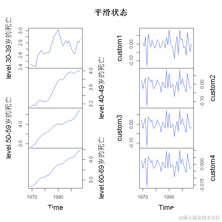 第一个参数是定义观测值的公式(左侧~)和状态方程的结构(右侧)。这里死亡人数/人口是一个单变量时间序列,状态方程是用矩阵来定义的,为了保持模型的可识别性,截距项用-1省略。观测水平方差通过参数H定义,NA值代表未知方差参数σ 2和σ 2 η。估计之后,进行过滤和平滑递归。