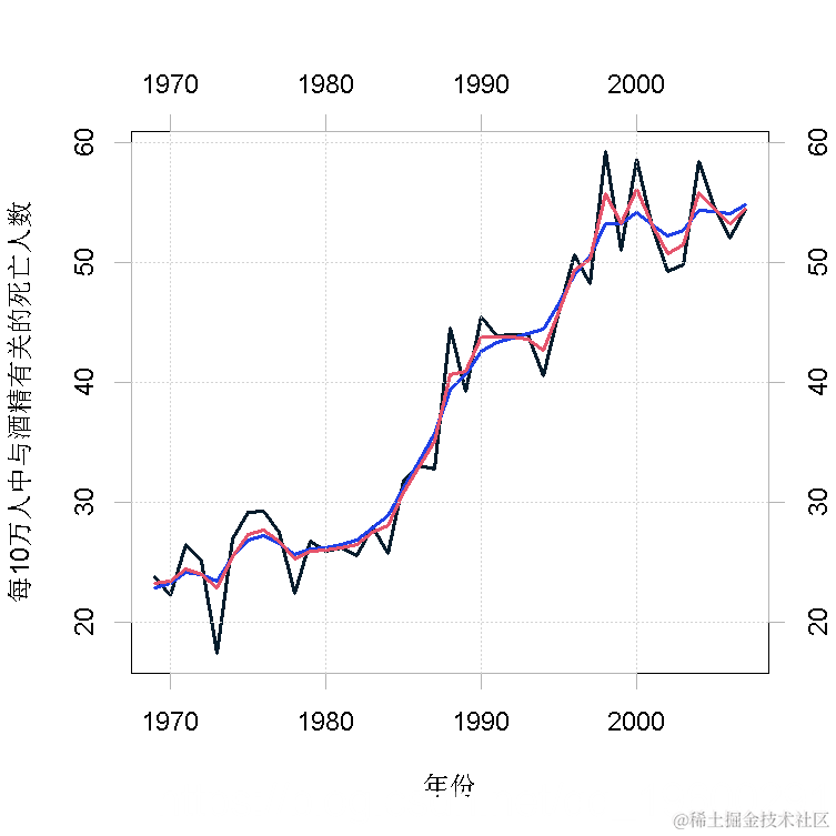 图2显示了以高斯过程(蓝色)和泊松过程(红色)为模型(每10万人的死亡人数)的平滑估计。