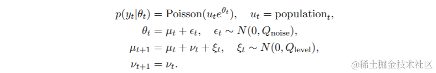 通过结合前面的方法,可以相对容易地构建大量的模型。对于这样做还不够的情况,可以通过直接定义系统矩阵来构建任意状态空间模型。作为一个例子,我们修改了之前的泊松模型,增加了一个额外的白噪声项,试图捕捉数据的可能的过度离散。现在我们的泊松强度模型是ut exp(µt + t),即