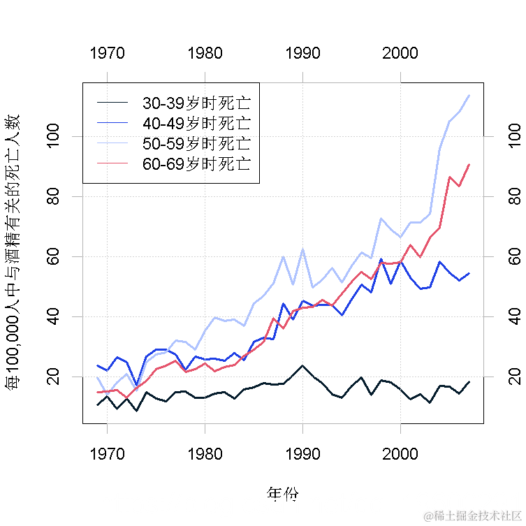我现在用一个比前面的例子更完整的例子来说明KFAS的使用。数据还是由酒精有关的死亡组成,但现在有四个年龄组,即30-39岁、40-49岁、50-59岁和60-69岁,被一起作为一个多变量泊松模型来建模。