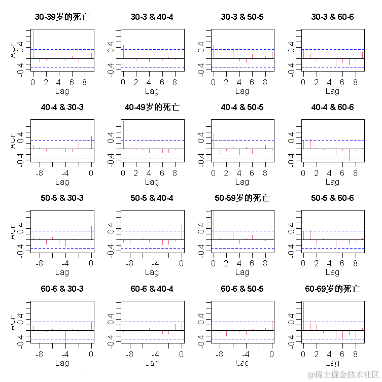 我们看到残差之间偶尔有滞后的交叉相关,但总体上我们可以对我们的模型相对满意。现在我们可以用我们估计的模型预测2008-2013年每个年龄组与酒精有关的死亡强度e θt。由于我们的模型是时间变化的(u变化),我们需要通过newdata参数为未来的观察样本提供模型。