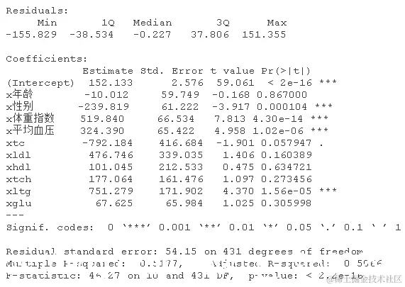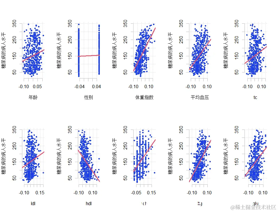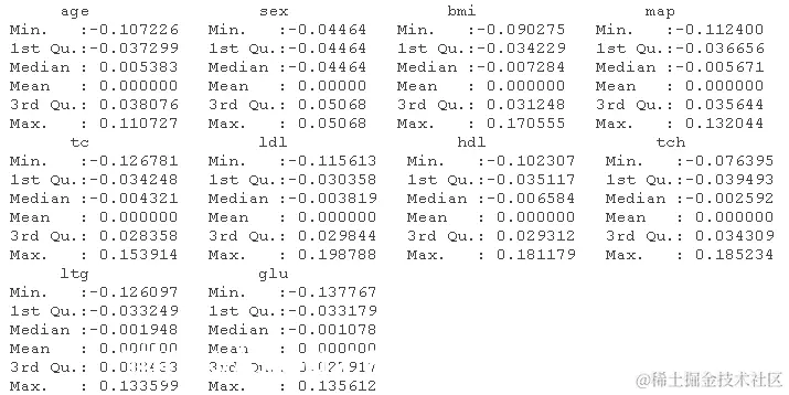 加载糖尿病数据集。这有关于糖尿病的病人水平的数据。数据为n = 442名糖尿病患者中的每个人获得了10个基线变量、年龄、性别、体重指数、平均血压和6个血清测量值,以及感兴趣的反应,即一年后疾病进展的定量测量。"