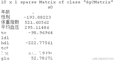 为了得到一个更简明的模型,我们可以使用一个更高的λ值,即在最小值的一个标准误差之内。用这个lambda值来得到β系数。注意,现在有更多的系数被缩减为零。