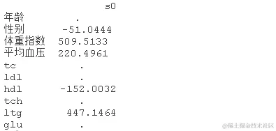 使用上一个练习中的lambda的最小值,得到估计的β矩阵。注意,有些系数已经缩减为零。这表明哪些预测因子在解释y的变化方面是重要的。