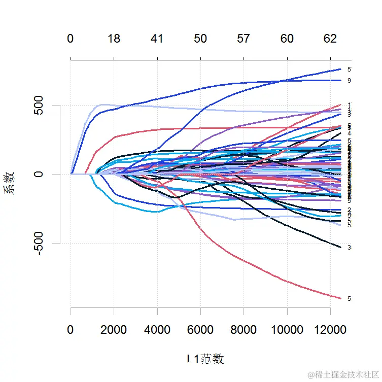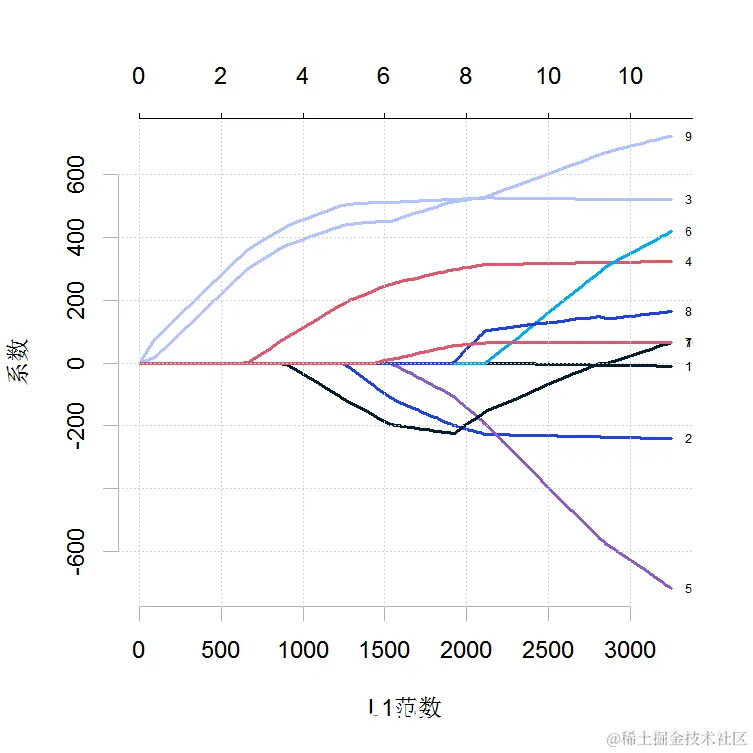 绘制x的每个变量系数与β向量的L1准则的路径。该图表明每个系数在哪个阶段缩减为零。