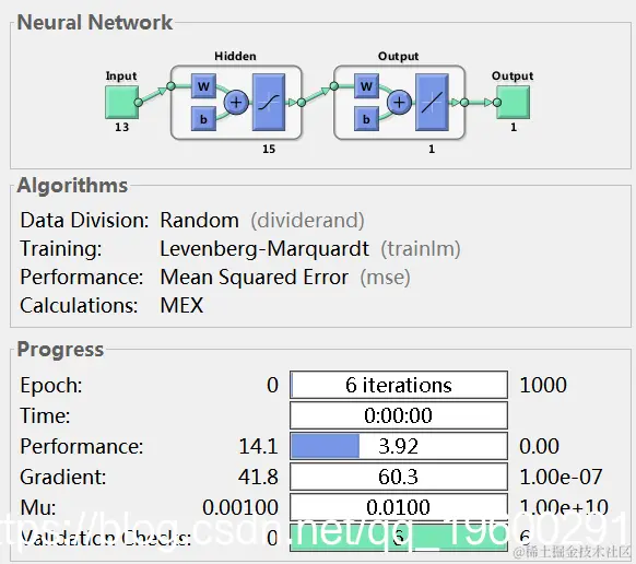 神经网络训练工具显示正在训练的网络和用于训练的算法。它还显示了训练期间的训练状态,停止训练的标准将以绿色突出显示。