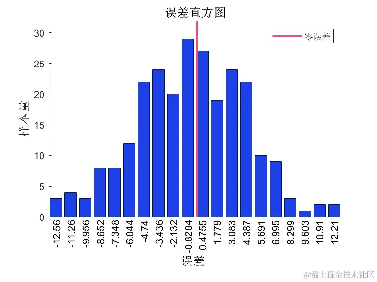 另一个衡量神经网络对数据的拟合程度的方法是误差直方图。这显示了误差大小是如何分布的。通常情况下,大多数误差接近零,很少有误差远离零。