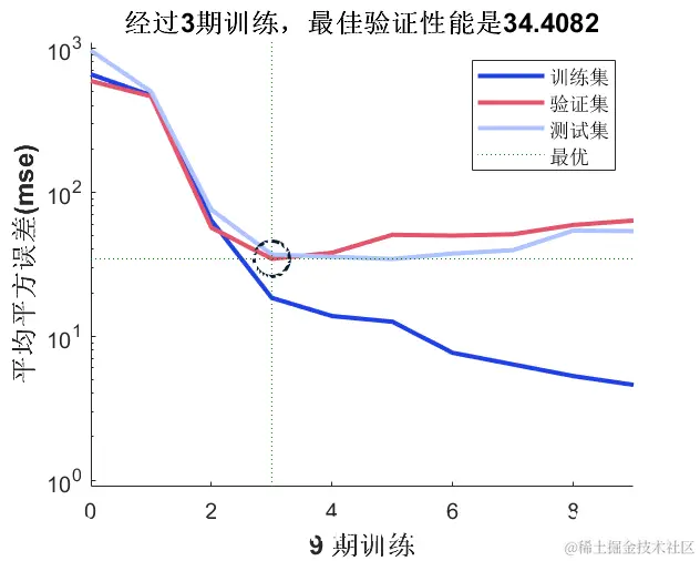性能是以均方误差来衡量的,并以对数比例显示。随着网络的训练,误差迅速减小。训练集、验证集和测试集的性能分别显示。最终的网络是在验证集上表现最好的网络。