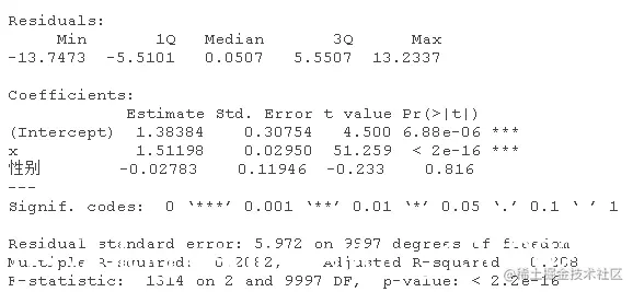 如果我们只将y回归到x和性别上,结果是