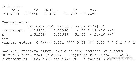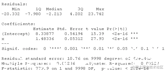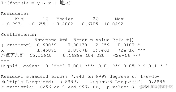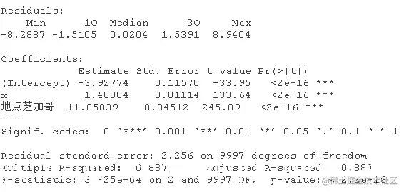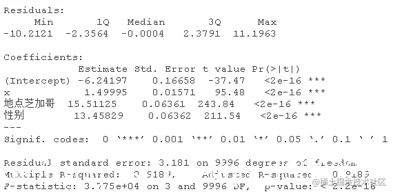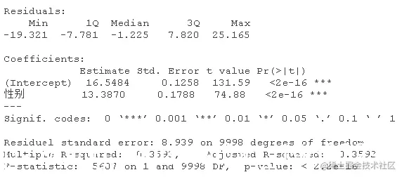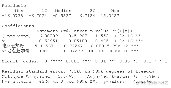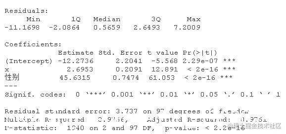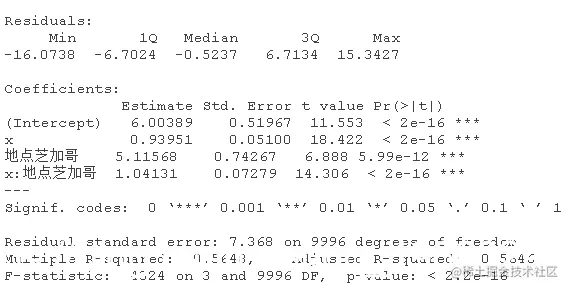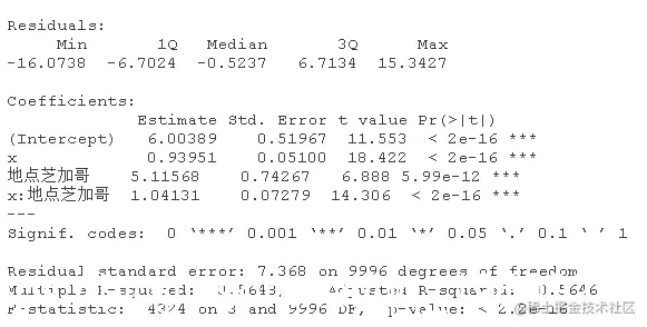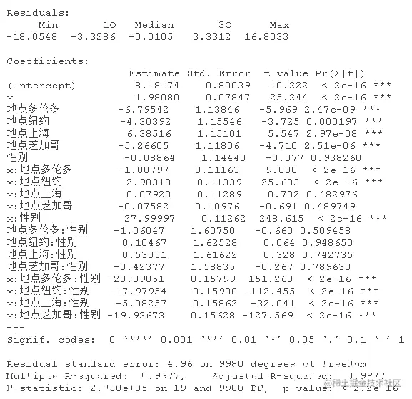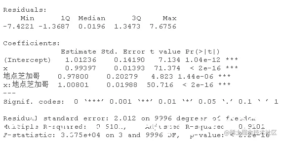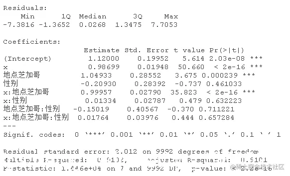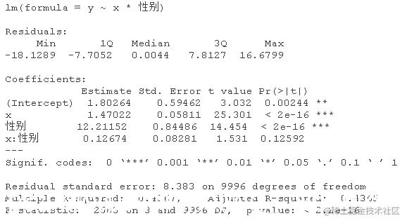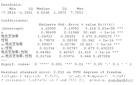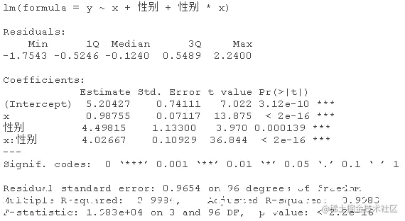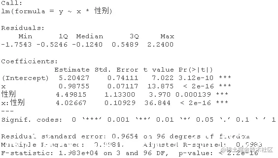 该模型表示,对于女性(性别=0),估计的模型是y=5.20+0.99x;对于男性(性别=1),估计的关系是y=5.20+0.99x+4.5+4.02x,也就是y=9.7+5.01x,相当接近真实关系。