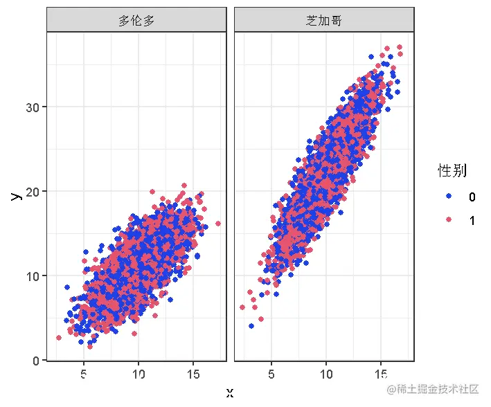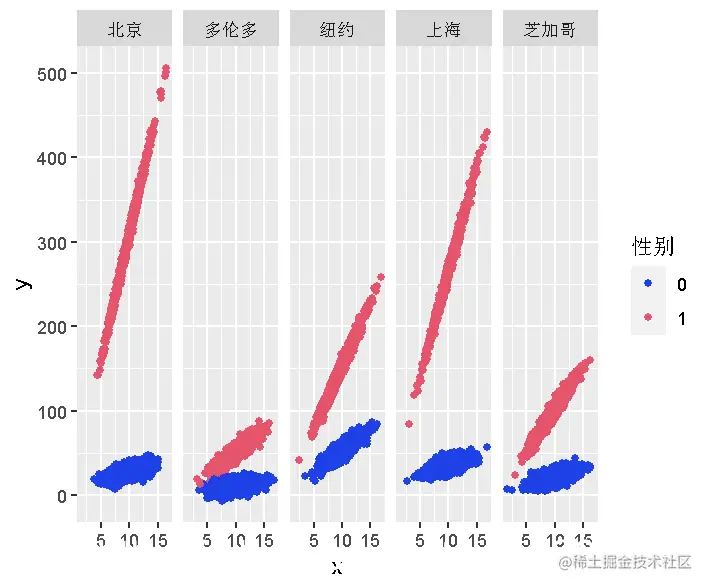 plot( x,y,color=性别 ~地点)