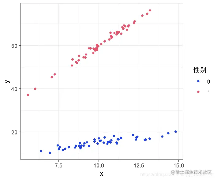 其中e是随机效应,平均值为零。因此,在y和x的真实关系中,性别既影响截距又影响斜率。