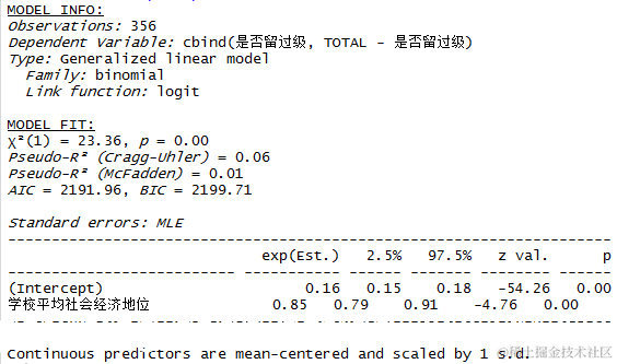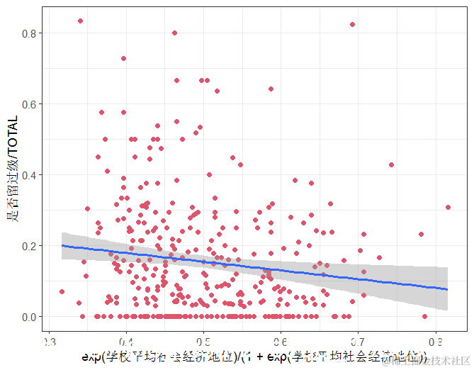 我们可以看到,留级的学生比例与学校平均社会经济地位的反对数呈负相关。请注意,我们将变量学校平均社会经济地位建模为其反对数,因为在二项式回归模型中,我们假设线性预测因子的反对数与结果(即事件比例)之间存在线性关系,而不是预测因子本身与结果之间存在线性关系。