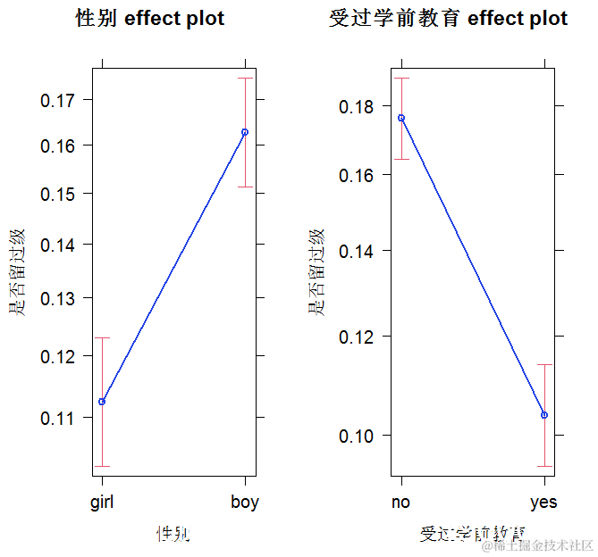 请注意,在这两张图中,Y刻度指的是留级的概率,而不是几率。概率比几率更容易解释。每个变量的概率分数是通过假设模型中的其他变量是常数并采取其平均值来计算的。正如我们所看到的,假设一个学生有平均的学前教育,作为一个男孩比作为一个女孩有更高的留级概率(~0.16)~0.11)。同样,假设一个学生有一个平均的性别,有学前教育的学生比没有学前教育的学生留级的概率低(~0.11)(~0.18)。请注意,在这两幅图中,还包括了估计值的置信区间,以使我们对估计值的不确定性有一些了解。