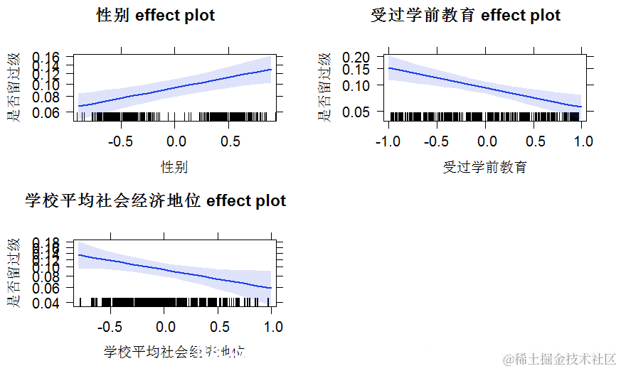我们还可以显示参数估计的效果。请注意,由于第一级分类变量(性别和学前教育)是中心化的,因此在模型中它们被当作连续变量,在下面的效果图中也是如此。