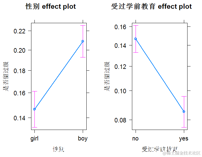 设置性别boy = 0意味着在学前教育效应图中,性别变量的参考水平被设置为0;学前教育yes = 0导致0成为性别效应图中学前教育变量的参考水平。