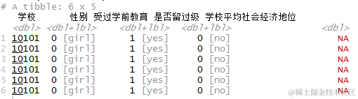 该数据来源于全国性的小学教育调查。数据中的每一行都是指一个学生。结果变量留级是一个二分变量,表示一个学生在小学教育期间是否留过级。学校变量表示一个学生所在的学校。个人层面的预测因素包括。 性别(0=女性,1=男性)和学前教育(受过学前教育,0=没有,1=有)。学校层面是学校平均SES(社会经济地位)得分。