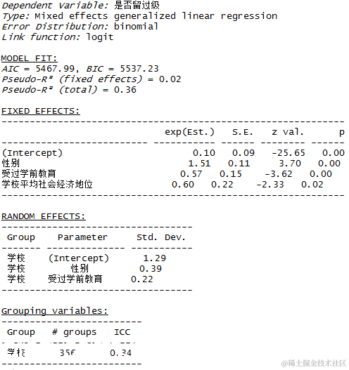glmer(是否留过级 ~ 性别 + 受过学前教育 + 学校平均社会经济地位 + (1 + 性别|学校),