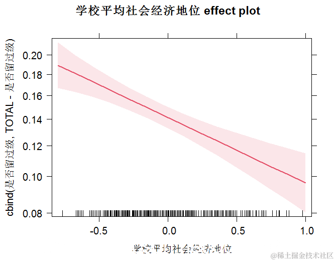 上面的图表显示了学校平均社会经济地位对学生留级概率的预期影响。在其他因素不变的情况下,随着学校平均社会经济地位的增加,一个学生留级的概率会降低(从0.19到0.10)。蓝色阴影区域表示每个学校平均社会经济地位值的预测值的95%置信区间。
