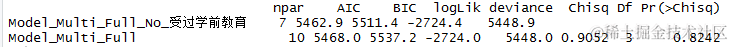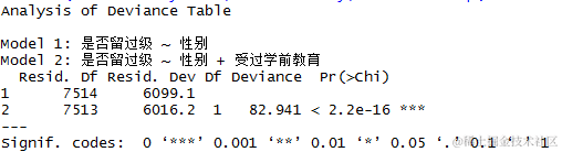 我们可以看到,同时包含性别和学前教育的预测因子的模型比只包含性别变量的模型对数据的拟合效果要好得多。请注意,这种方法也可以用来确定是否有必要包括一个或一组变量。