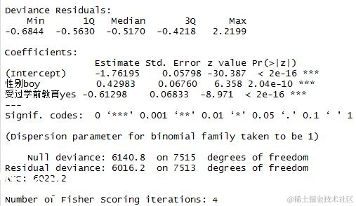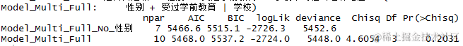 在AIC值较小的情况下,同时具有性别和学前教育预测因子的模型优于只具有性别预测因子的模型。