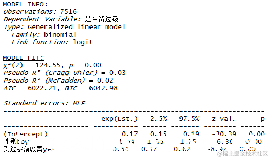 从上面的总结输出中,我们可以看到,性别对学生留级的概率有正向和显著的预测,而学前教育则有负向和显著的预测。具体来说,与女孩相比,男孩更有可能留级。以前上过学的学生不太可能导致留级。
